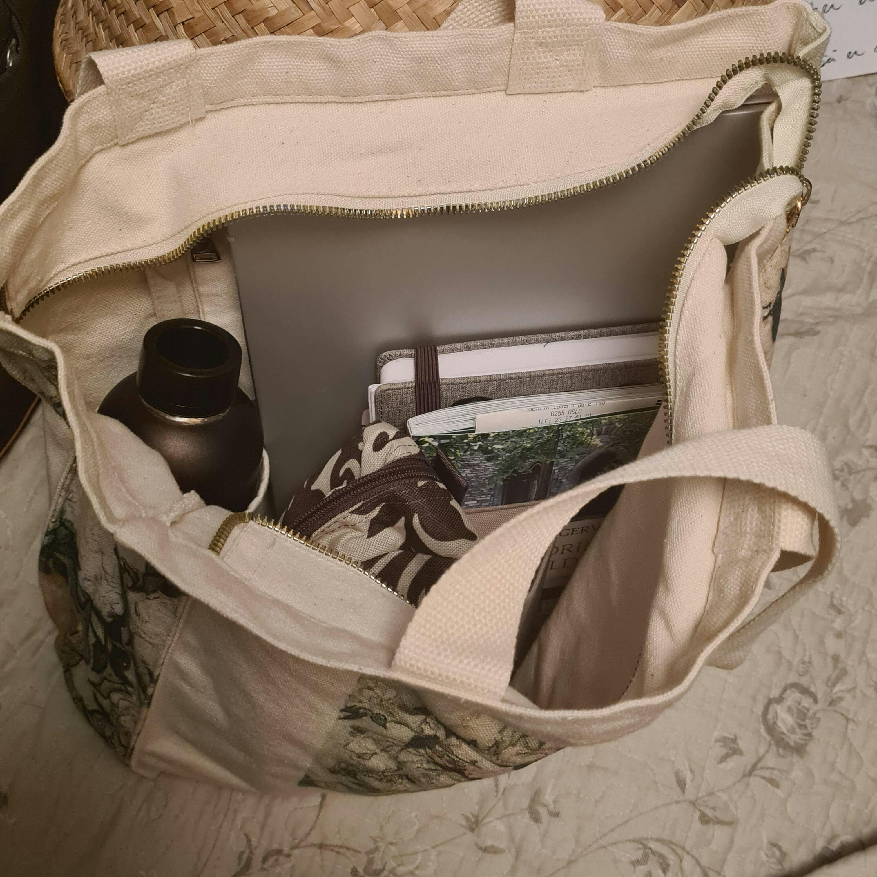 Beautiful tote. Feels quite luxorious with the zipper and room for bottle insde. Sueprisingly spacipus. Love the sidepanels with print.